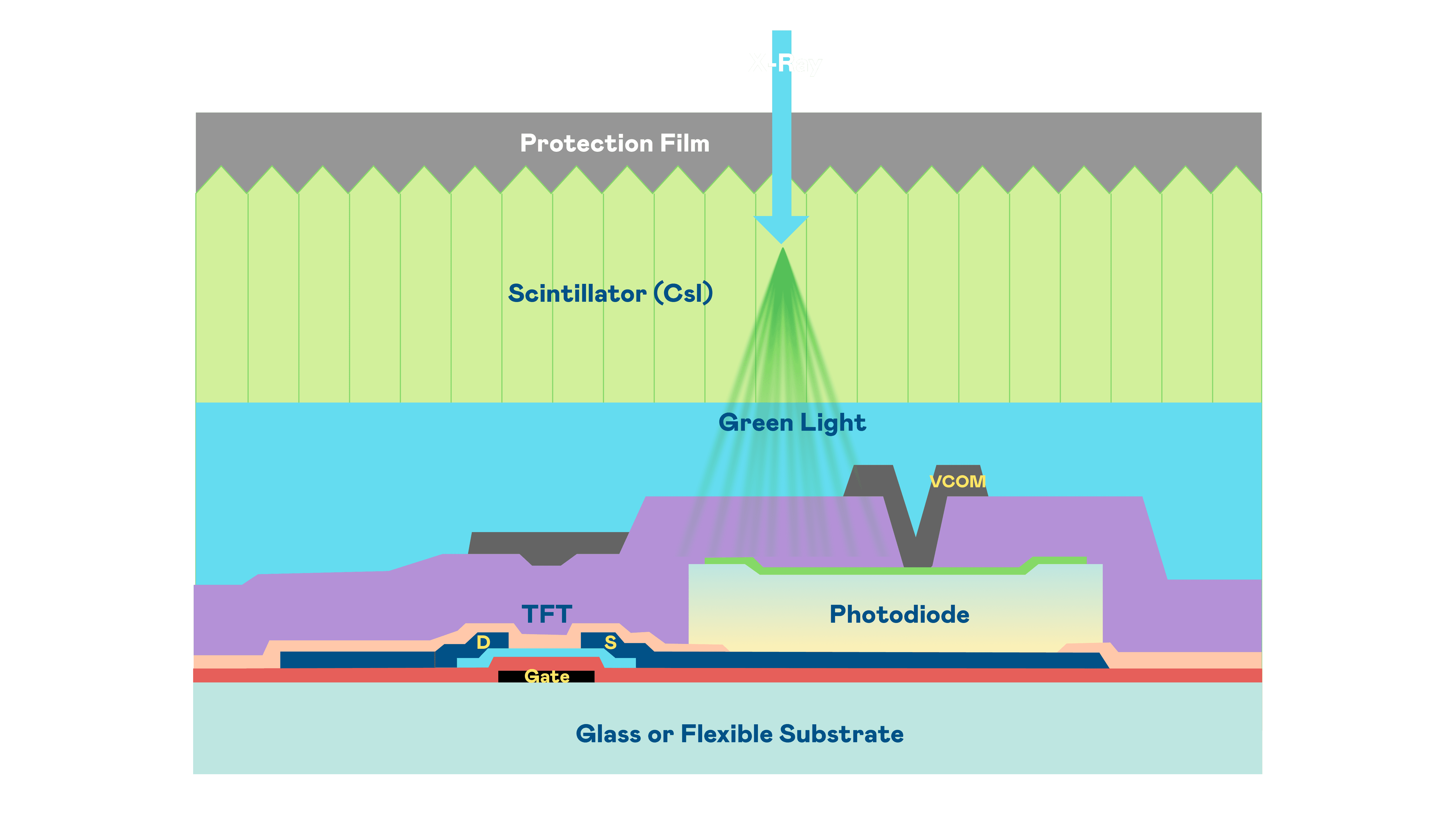 YAXIN111开发大尺寸TFT加上光电二极体 (photodiode)应用于X光影像感测,,,光灵敏度高的元件技术,,,,可降低X光摄影时人体接收之辐射剂量。。。除了玻璃基板之外,,,亦可选择柔性基板,,,,做为可携式的医疗与工业用X光影像感测器。。。。