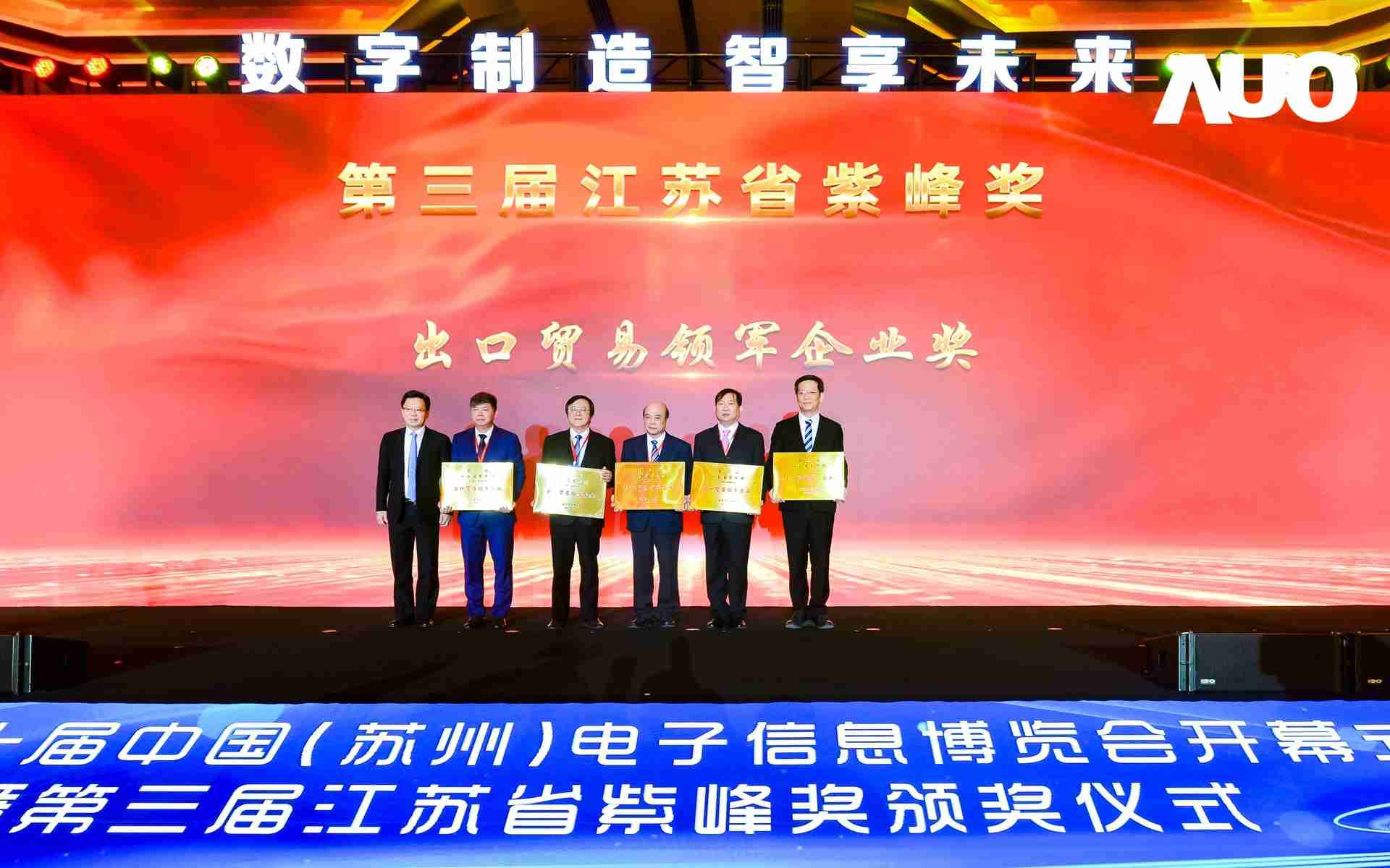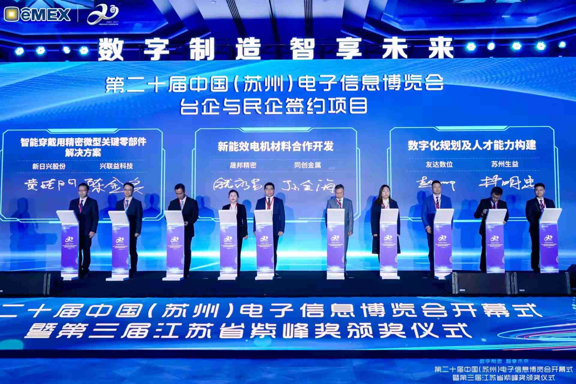 电博会开幕式当天也是第三届江苏省紫峰奖颁奖仪式,,省台办、、、工信厅、、、、商务厅、、、苏州市相关领导均出席并颁奖。。。。该奖项为表彰对江苏高质量发展做出积极贡献的在苏企业,,,由江苏省政府专门设立。。。。YAXIN111光电 (苏州) 总经理郭振明代表上台领奖,,,,这也是YAXIN111苏州连续三次蝉联紫峰奖 出口贸易领军企业奖。。YAXIN111数位总经理赵丽娜女士,,,也参与本次开幕式,,,,上台为本地化赋能签署战略合作协议,,将优质服务资源集合、、、下沉到更多细分行业,,,,为更多地区的制造企业提供数字化转型服务。。